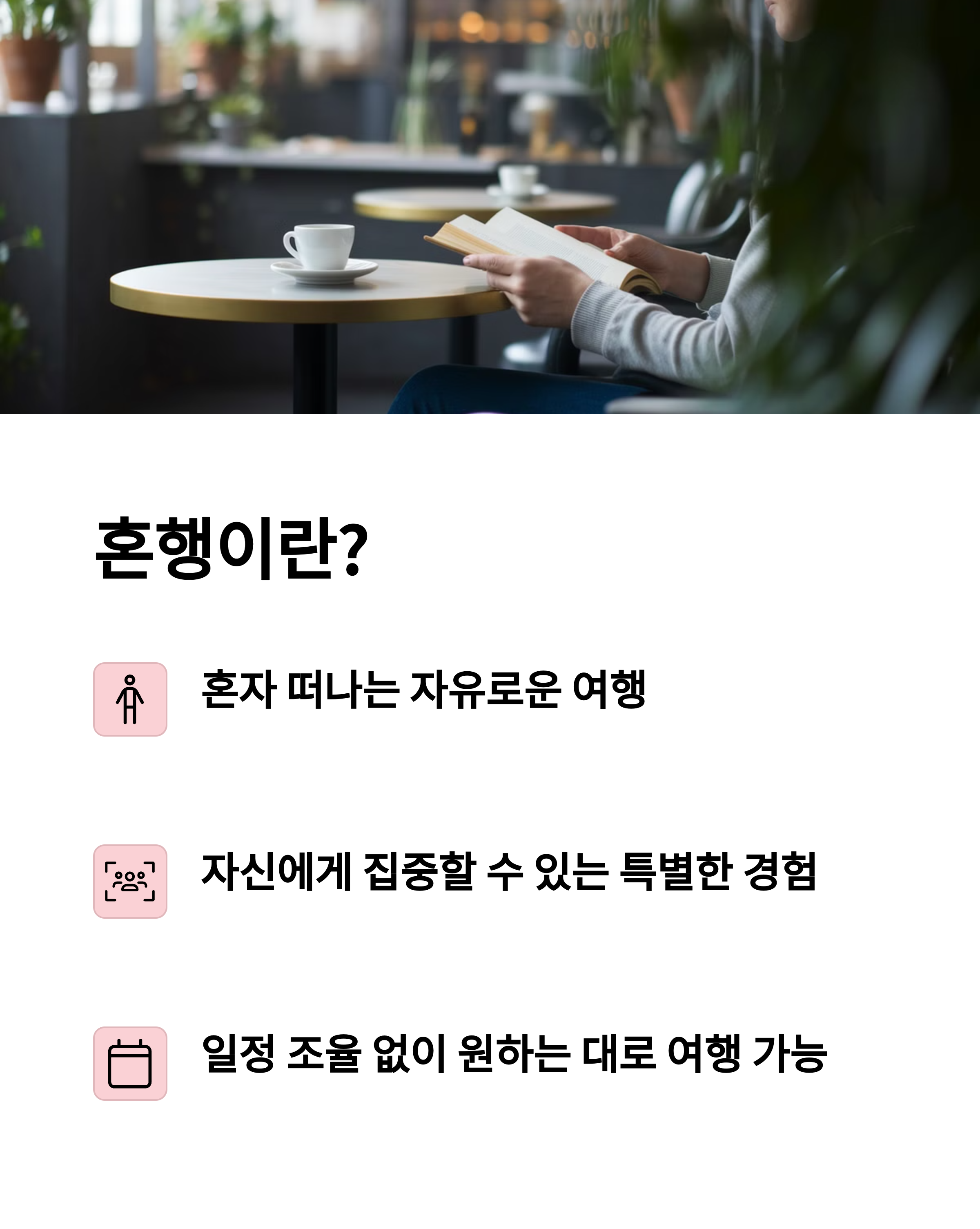 | 혼행이란? | 혼자 떠나는 여행을 의미하며, 자유로운 일정이 특징입니다 |