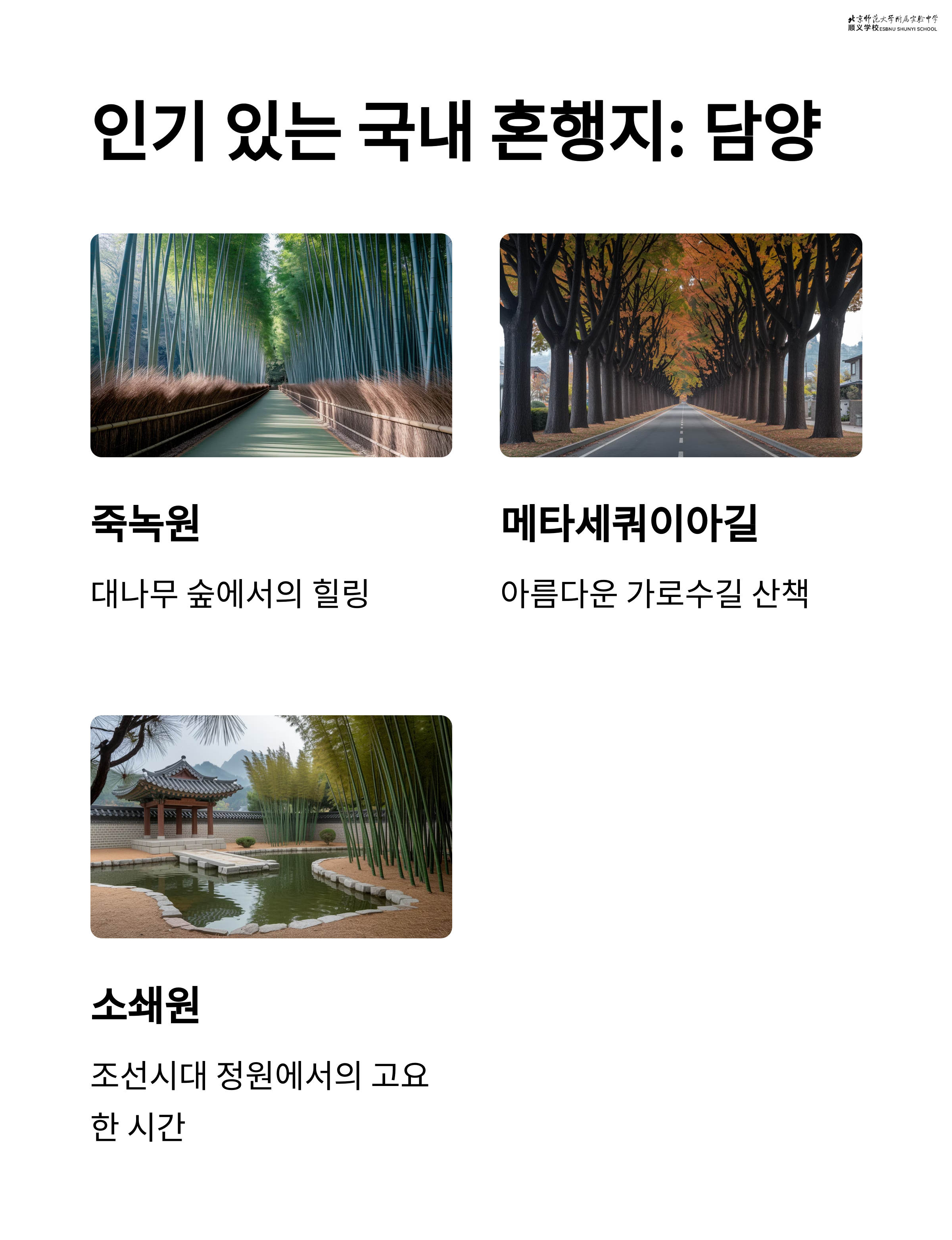 최근 혼행족들이 많이 찾는 국내 여행지 중 하나는 바로 전라남도 담양입니다 죽녹원과 메타세쿼이아길은 사진 명소이자 산책 코스로 유명하며 혼자 걸어도 전혀 어색하지 않은 풍경이 펼쳐집니다 담양은 전반적으로 조용하고 평온한 분위기라 혼행 초보자들에게도 부담 없이 추천드릴 수 있습니다