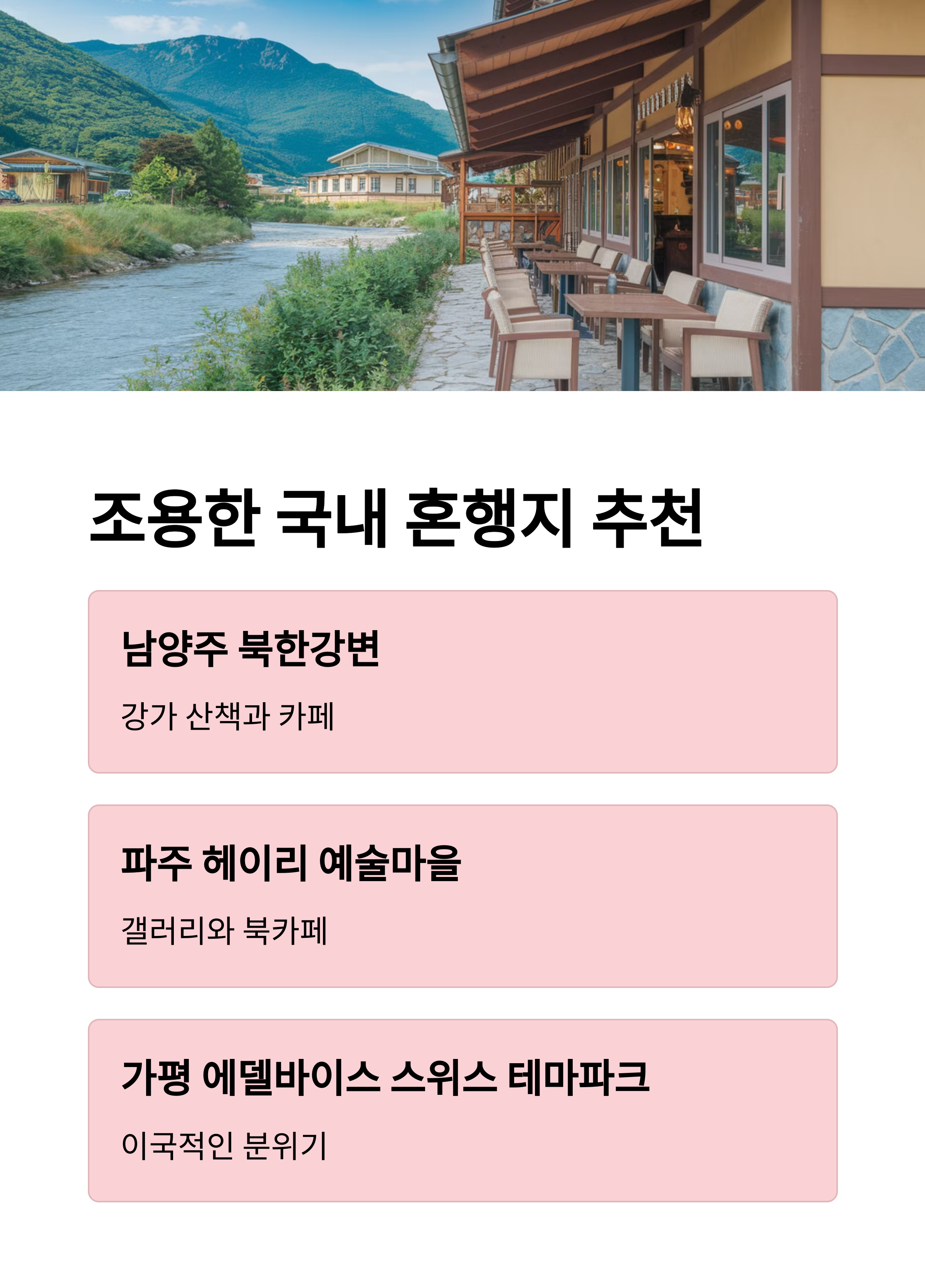 | 담양, 통영, 제주도 | 조용하고 자연친화적, 나 홀로 여행자에게 적합 | 짐은 가볍게, 계획은 유연하게, 카페 활용도 높임 |