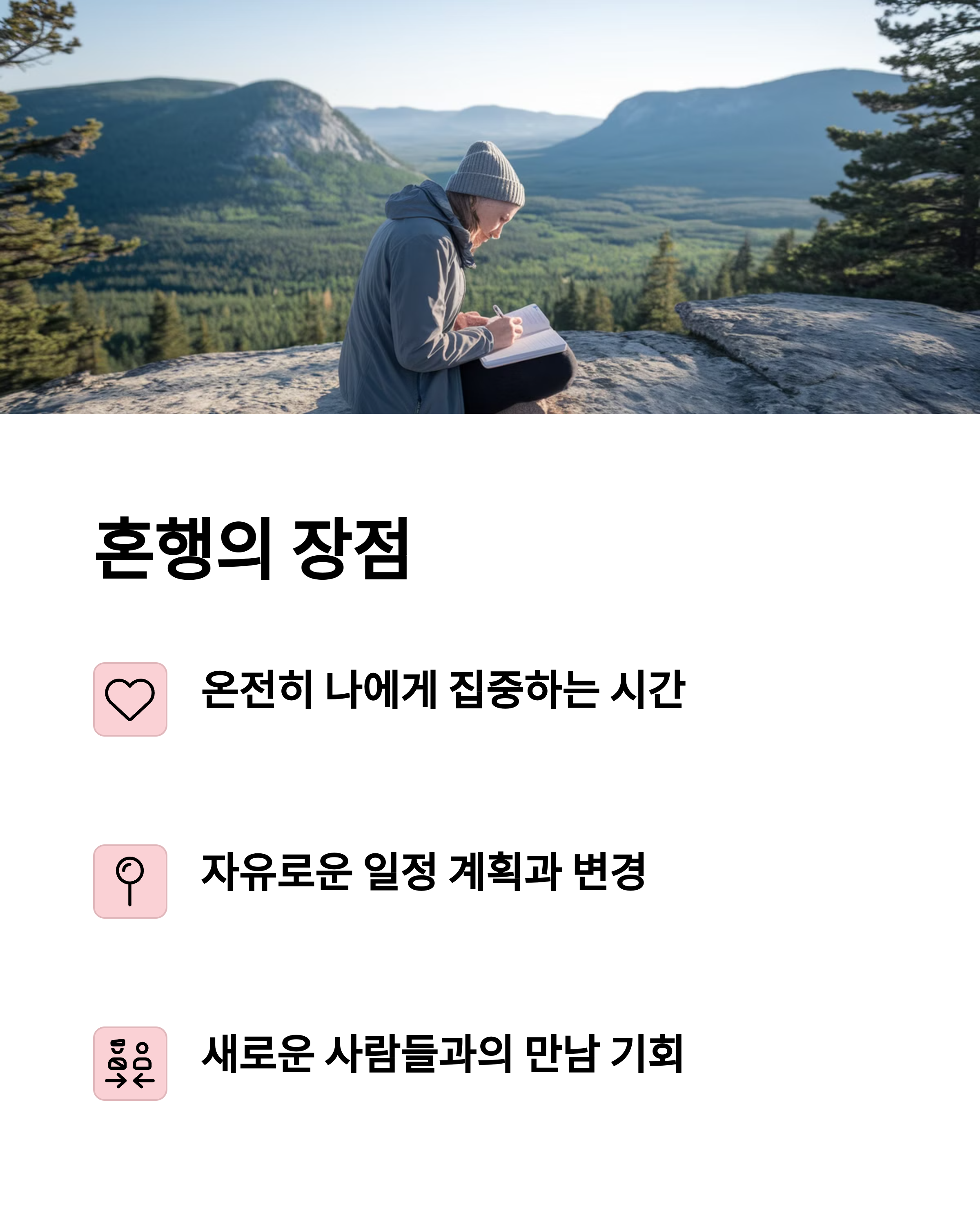 | 혼행 추천 이유 | 자신만의 시간 확보, 일정 조율 필요 없고 온전히 나만을 위한 여행이 가능 |