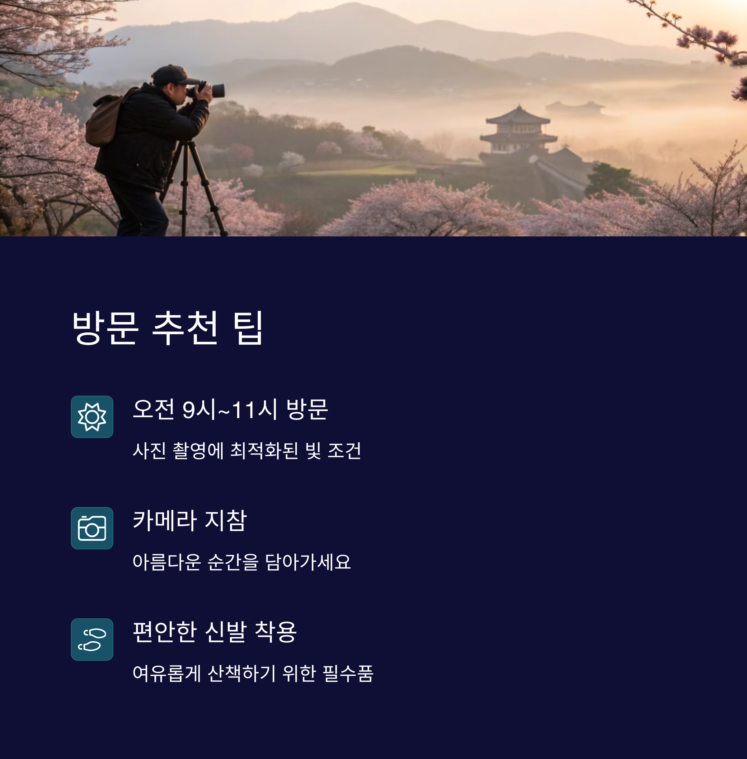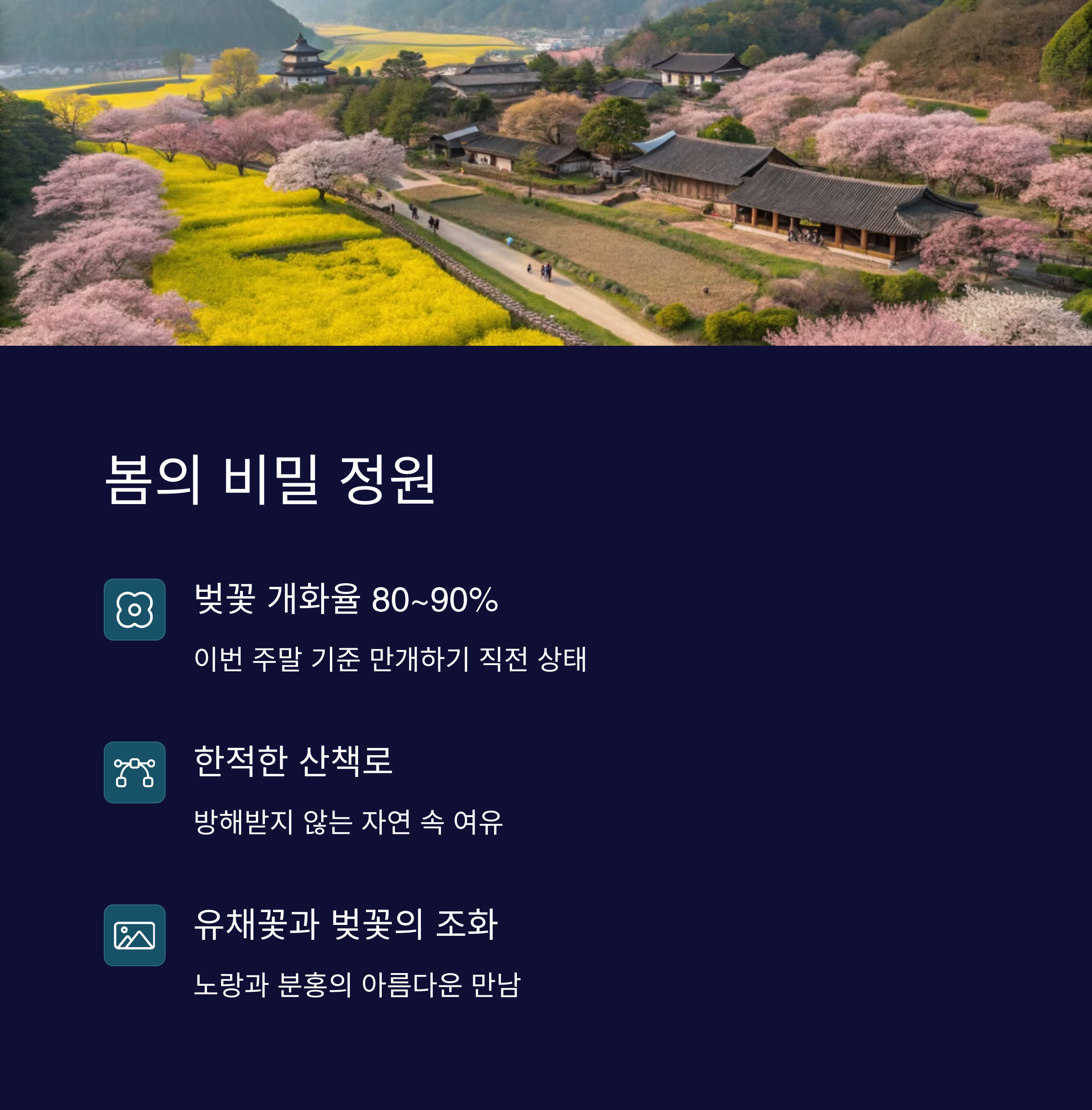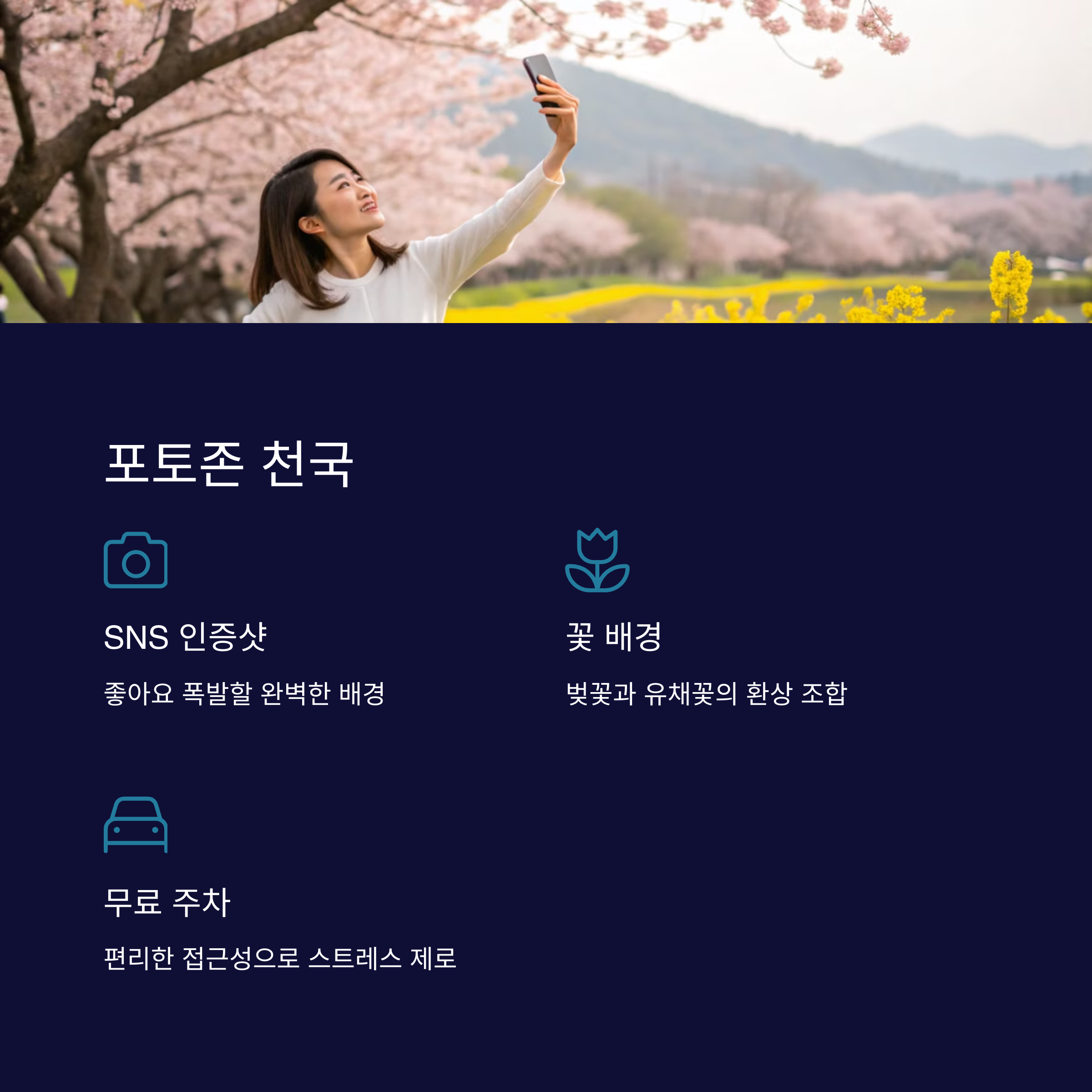 | 벚꽃 개화 상태 | 인생 사진 명소 | 교통 및 주차 |