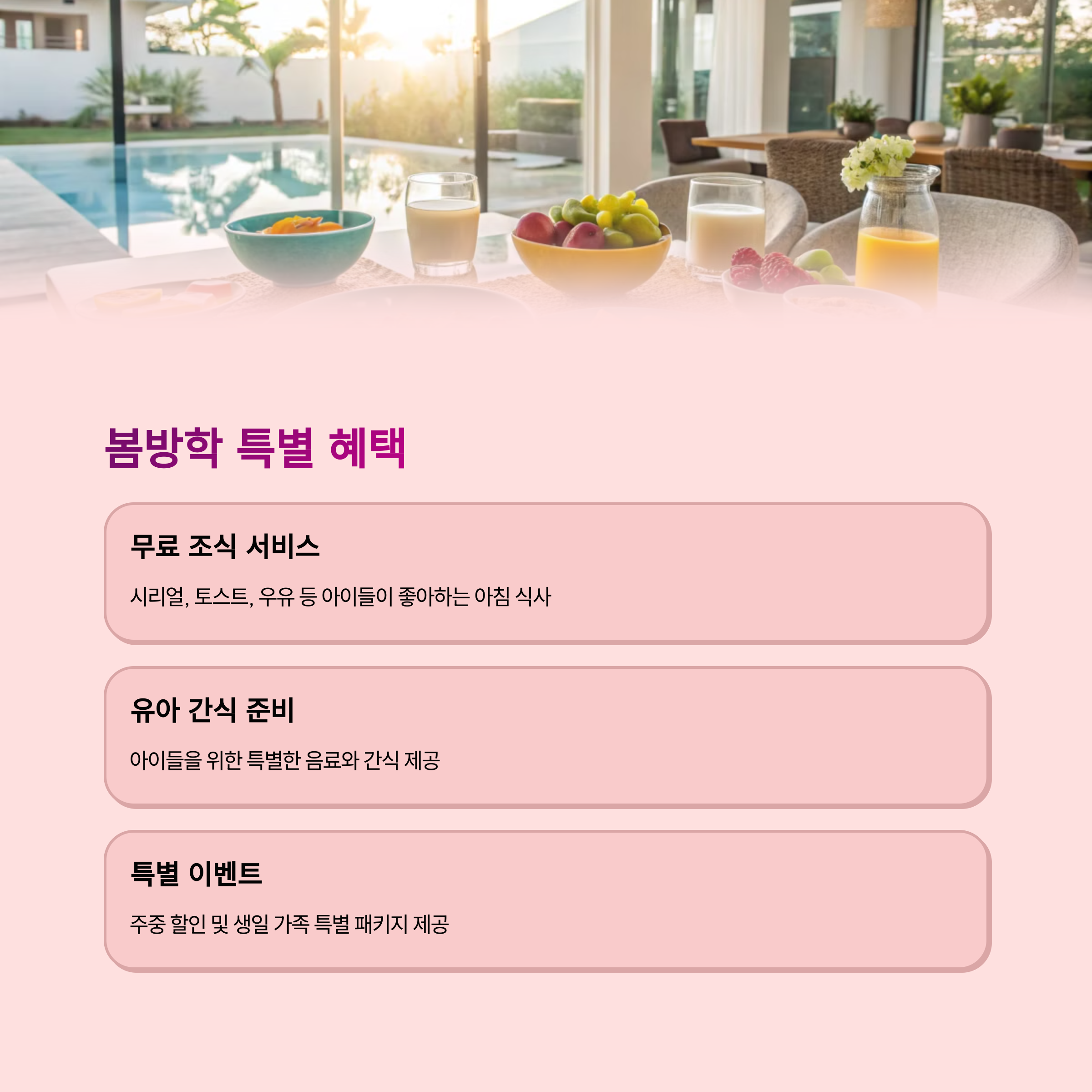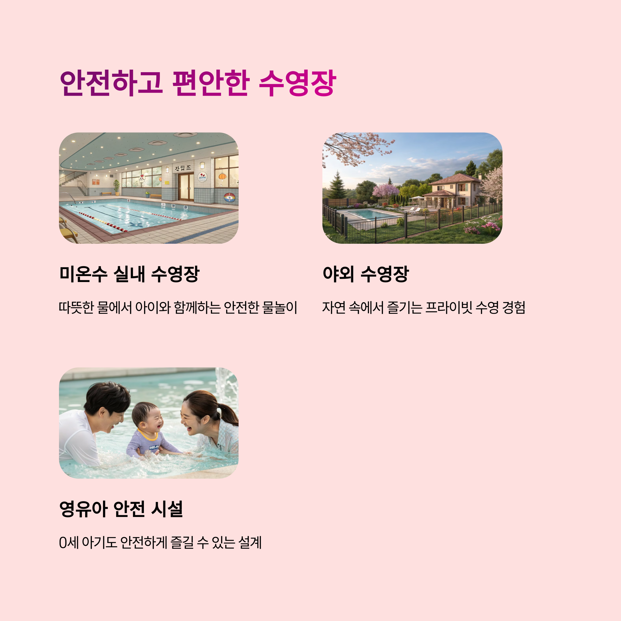 | 2022년 5월 오픈, 개별 수영장과 키즈 전용 시설 완비 | 미온수 풀 포함, 사계절 내내 물놀이 가능 | 감각적인 인테리어와 넓은 실내 공간 제공 |