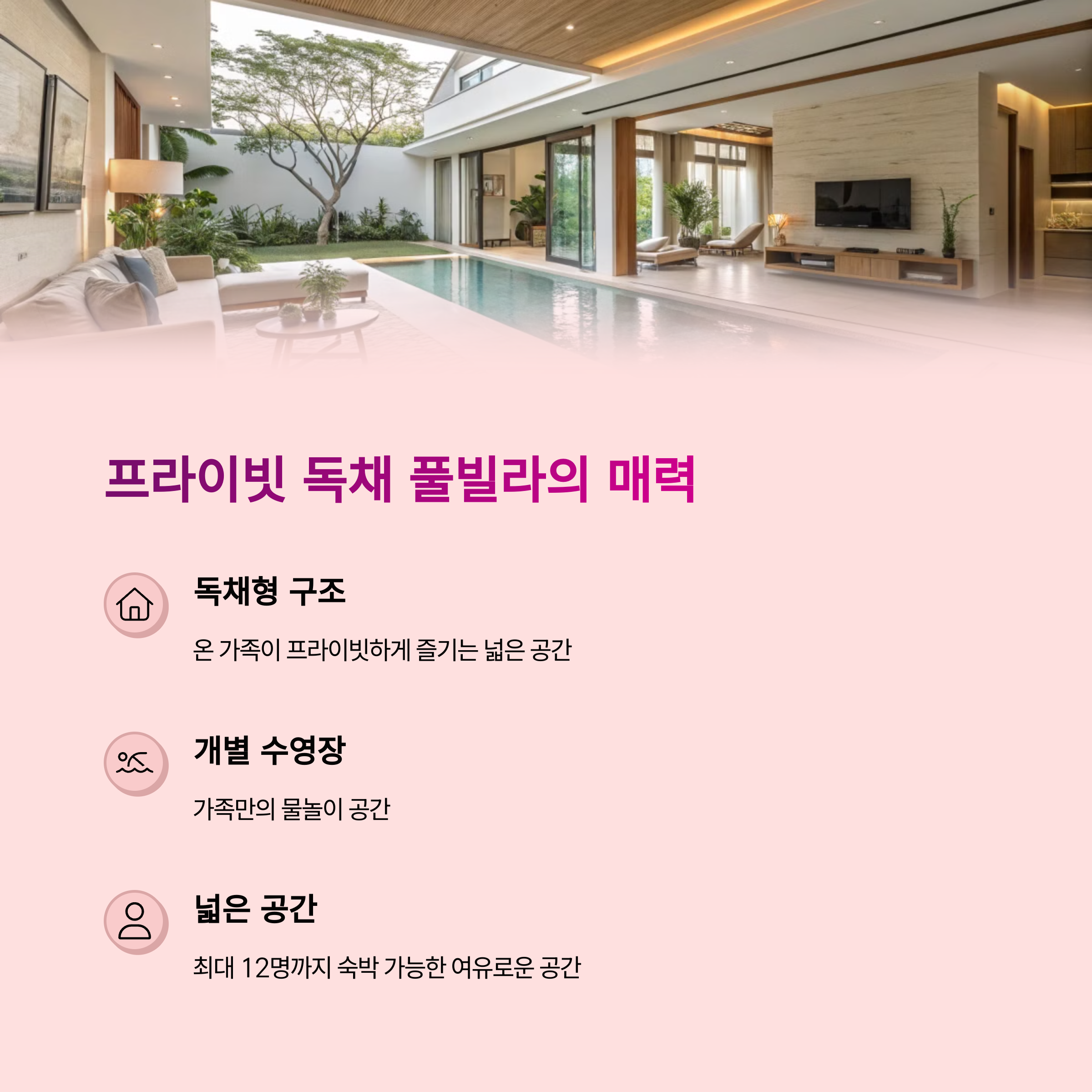 | 가족 단위 여행객들에게 인기 있는 최신 숙소 | 독채형 숙소로 프라이버시 보장 | 가족 모두가 만족할 수 있는 다양한 시설 제공 |