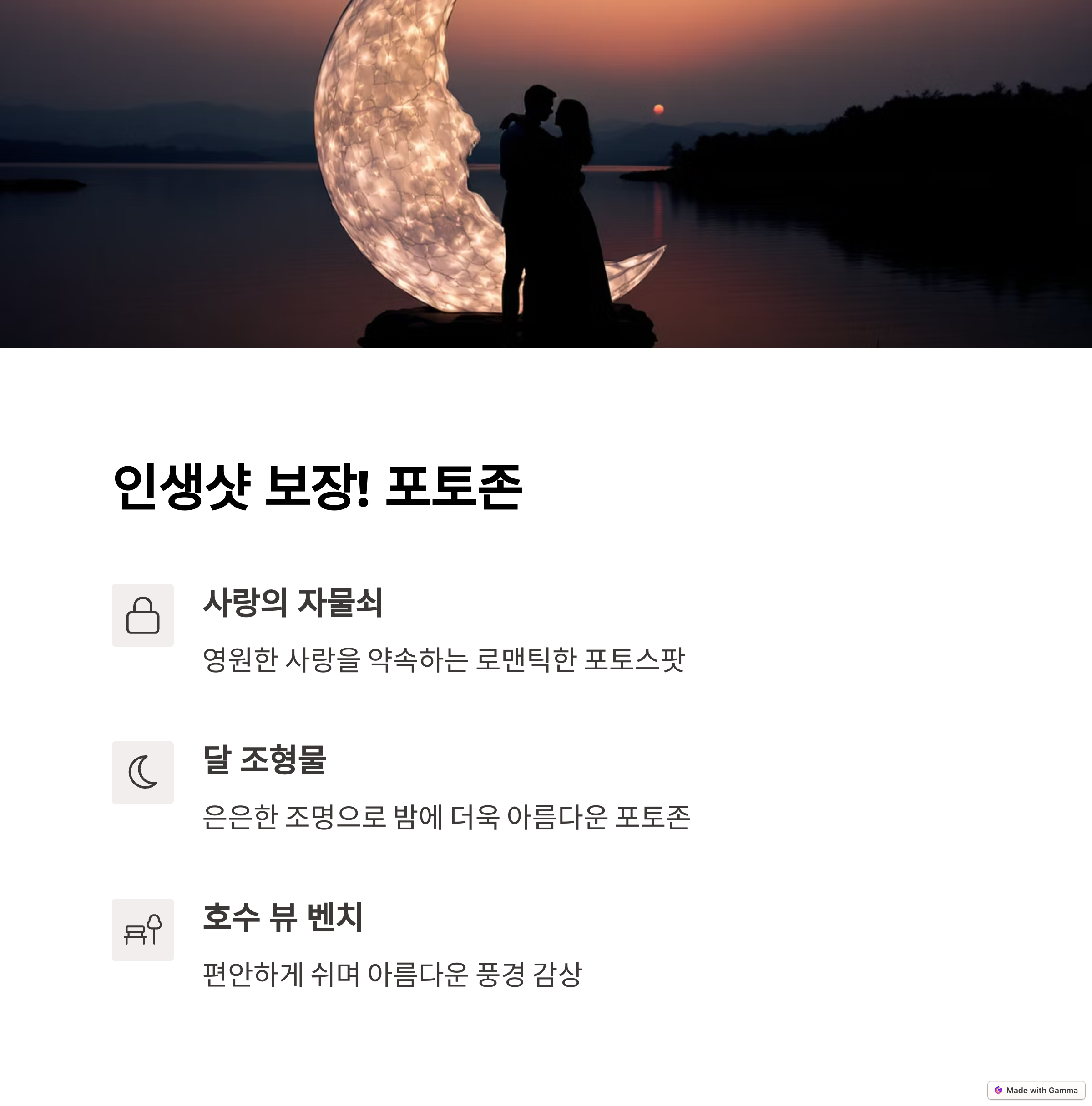 | 사계절 풍경이 아름다운 인기 장소 | 벤치, 포토존 등 휴식공간 풍부 | 하루 코스로 알맞은 데이트플레이스 |