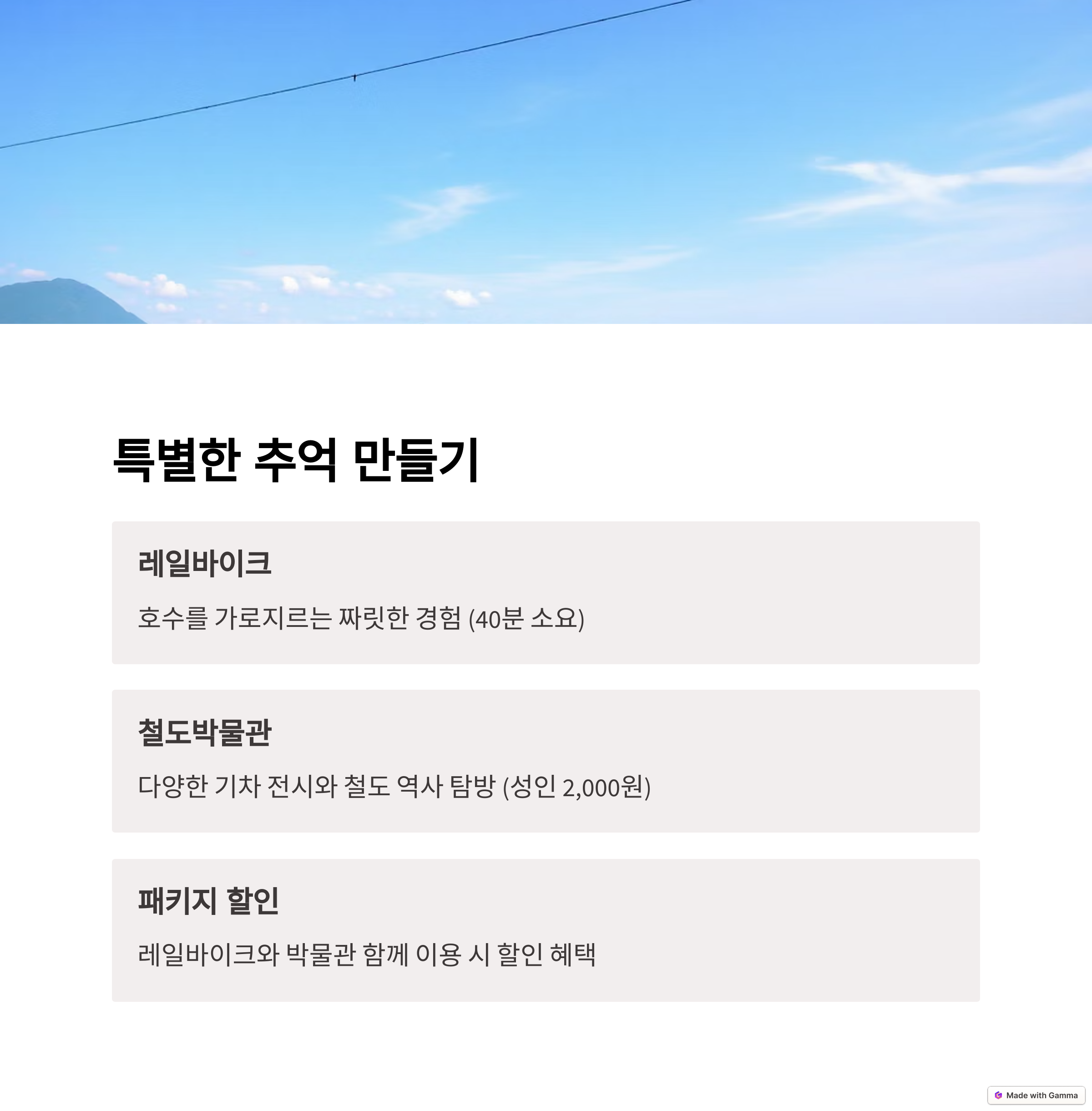 | 자연과 함께하는 감성적인 걷기 코스 | 호수 둘레를 따라 걷는 평탄한 산책로 | 차로 30분 거리, 쉽게 접근 가능 |