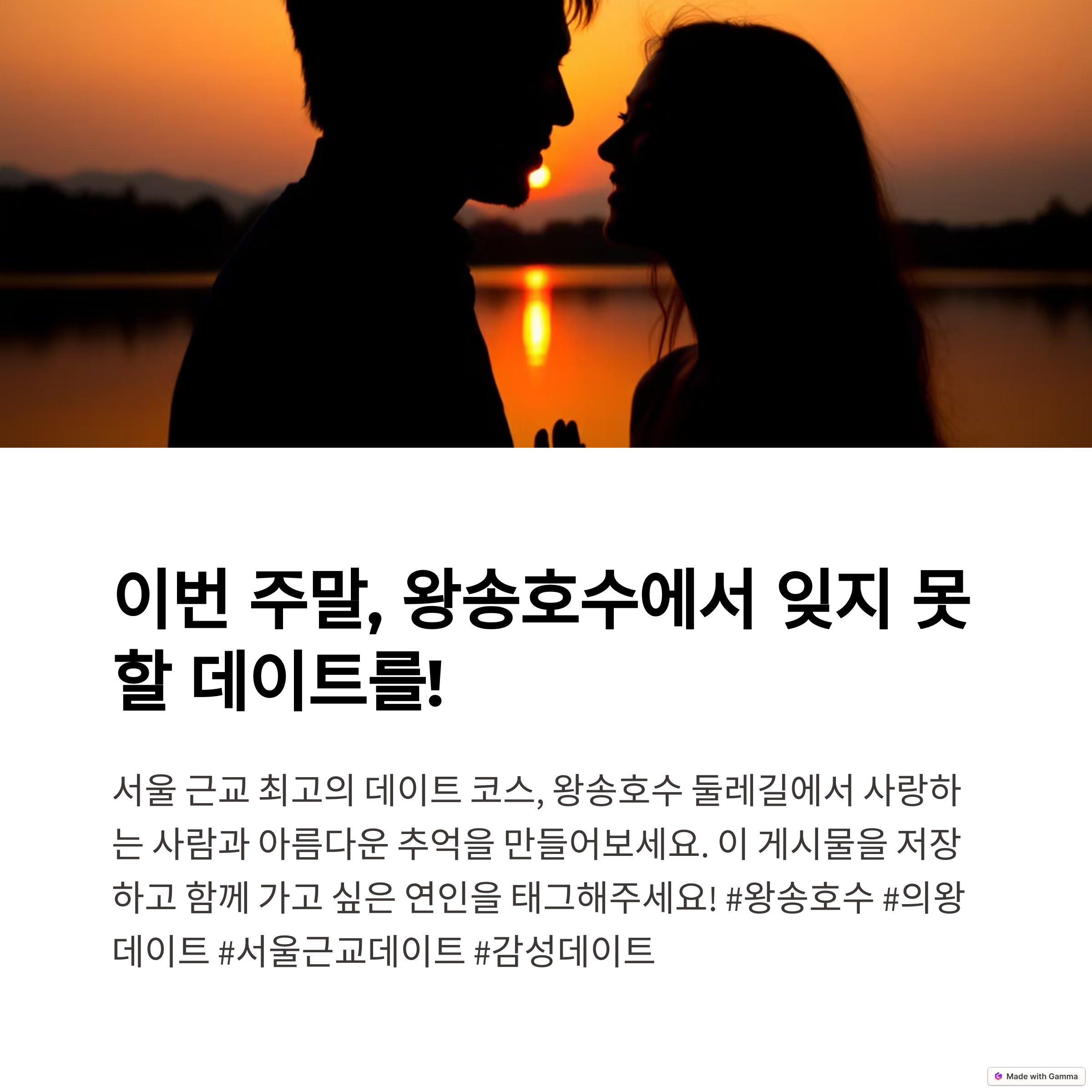 사랑하는 사람과의 소중한 시간을 더 특별하게 만들고 싶으신가요? 오늘은 서울 근교에서 즐길 수 있는 감성적인 데이트코스를 소개해 드리려고 합니다. 바쁜 일상 속에서도 주말이나 휴일을 활용해 가볍게 다녀올 수 있는 곳이라면, 더욱 완벽한 데이트가 될 수 있겠죠. 특히 이번에 소개해드릴 의왕 왕송호수 둘레길은 걷기 좋은 호숫가 산책로와 조용하고 낭만적인 분위기로 커플들에게 큰 사랑을 받고 있는 명소입니다. 봄에는 벚꽃이 흐드러지고, 여름엔 시원한 바람과 초록빛 자연을 만끽할 수 있으며, 가을에는 붉게 물든 단풍과 함께 분위기 있는 풍경이 펼쳐집니다. 무엇보다 서울에서 차로 30분이면 도착할 수 있는 거리이기 때문에 부담 없이 다녀오기에도 아주 적합합니다. 연인과의 추억을 소중히 간직할 수 있는 감성 데이트코스, 지금부터 하나씩 정리해드릴게요. 날씨 좋은 날, 도시의 번잡함을 벗어나 자연 속에서 함께 걷는 여유, 그 소중한 시간을 놓치지 마세요.