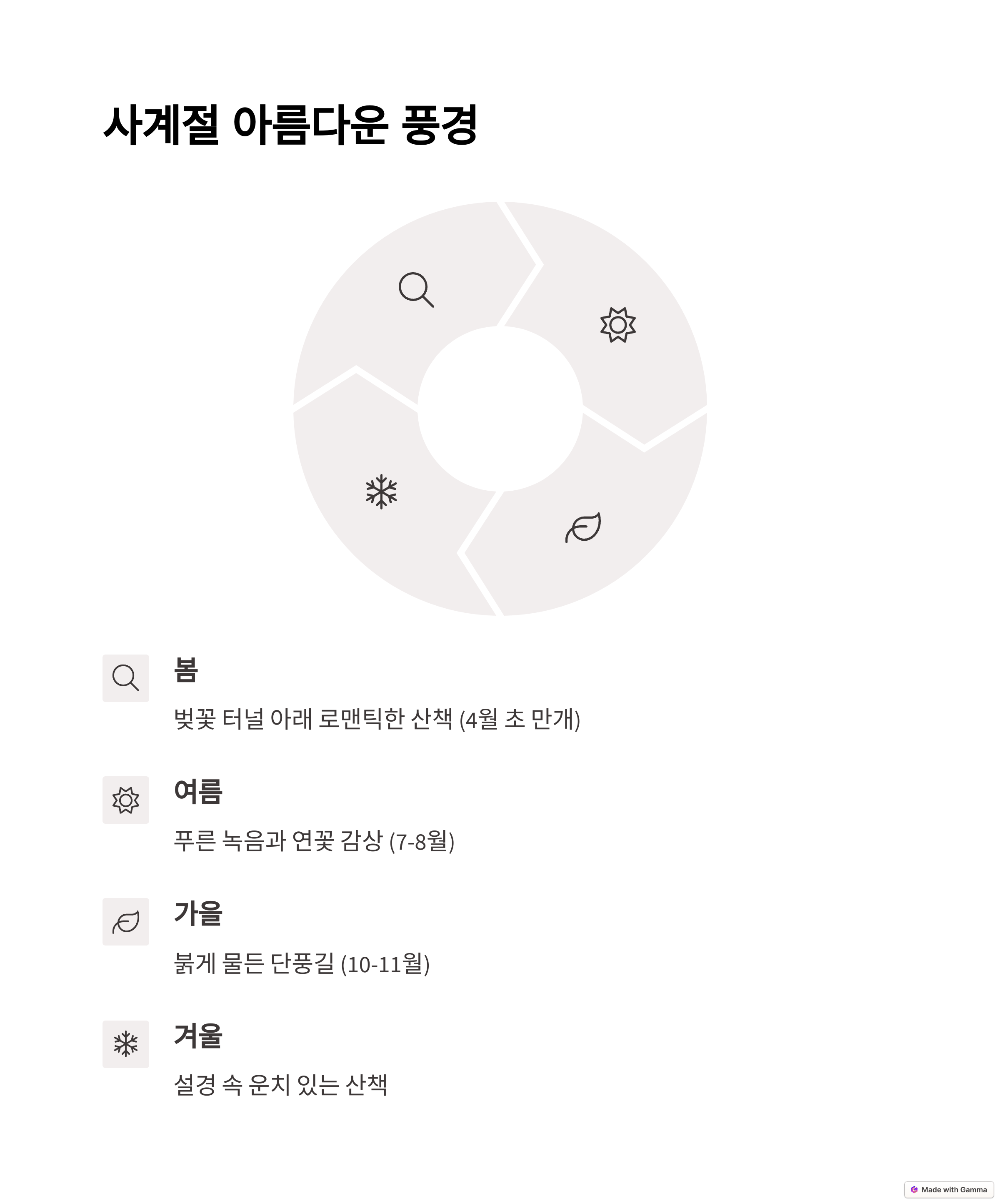 | 추천 시즌 | 봄 벚꽃철, 가을 단풍철에 특히 인기가 많습니다. |
