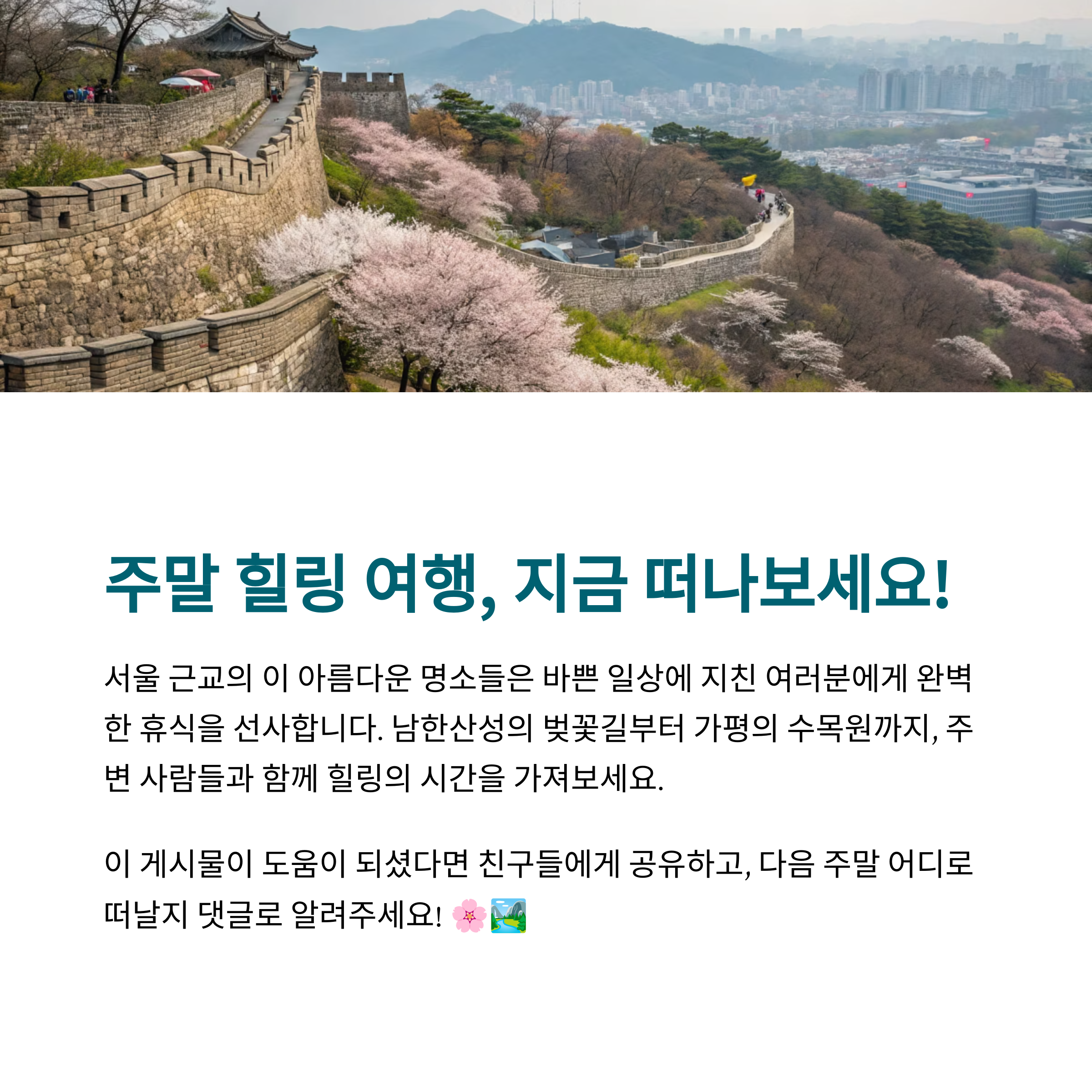 | 주말 힐링 여행 | 서울 근교 자연 속에서 편안한 휴식을 즐겨보세요 |