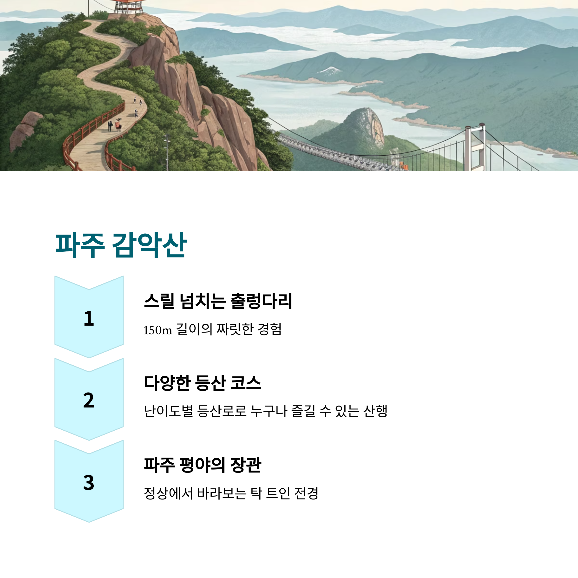 역사와 함께하는 여행지도 있습니다. 남양주의 다산 정약용 유적지는 조선시대의 학문과 정신을 엿볼 수 있는 교육적 공간이자 한강변의 여유로운 풍경으로 힐링을 선사하죠. 파주의 감악산은 출렁다리와 잘 정비된 등산로로 남녀노소 누구나 찾기 좋은 명소입니다. 특히 가족 단위나 연인끼리 방문하면 만족도가 높습니다.