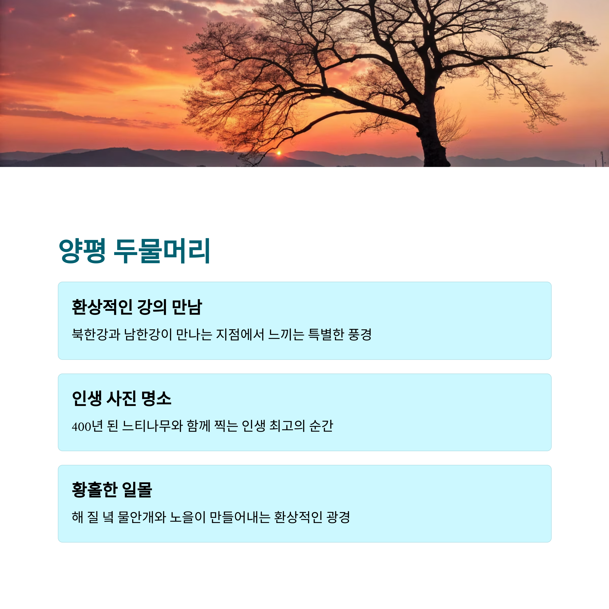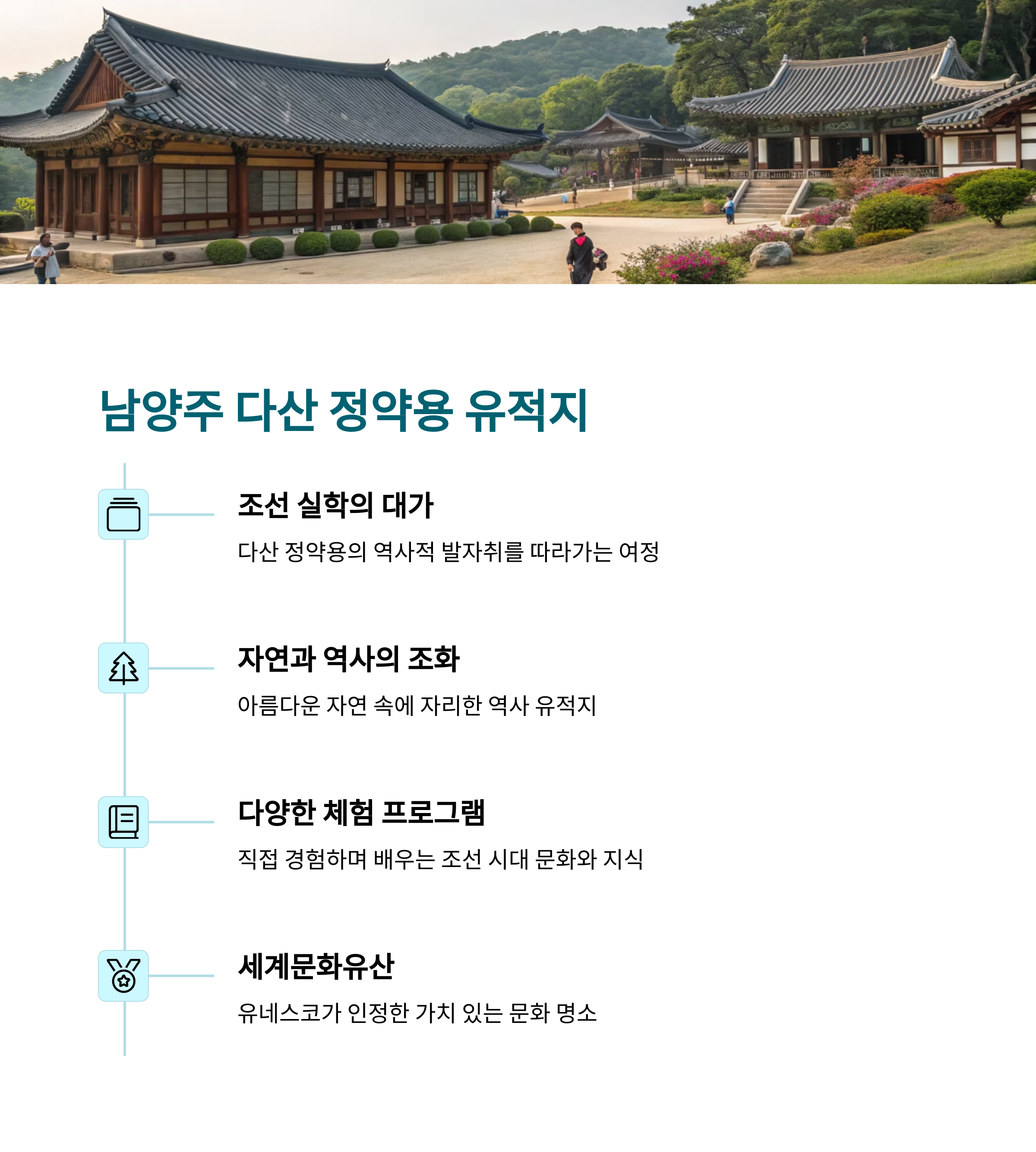 | 숲과 꽃이 어우러진 공간에서의 여유 | 정약용 유적지로 배우는 조선의 지혜 | 일몰과 풍경이 아름다운 두물머리 |
