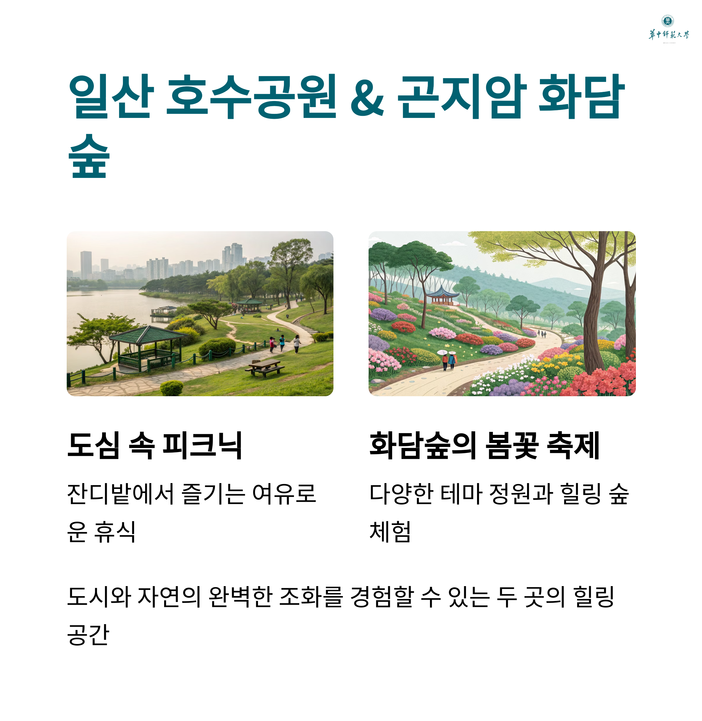 일산 호수공원은 도심 한가운데에서도 자연을 만끽할 수 있는 대표적인 피크닉 장소이며, 곤지암 화담숲은 계절마다 다른 테마의 꽃길과 숲 체험 프로그램이 준비되어 있어 온 가족이 함께 힐링할 수 있습니다. 봄이면 벚꽃이 흐드러지게 피는 남한산성 또한 성곽길을 따라 걷는 것만으로도 특별한 경험이 됩니다. 서울에서 1~2시간이면 도착 가능한 접근성도 큰 장점입니다.