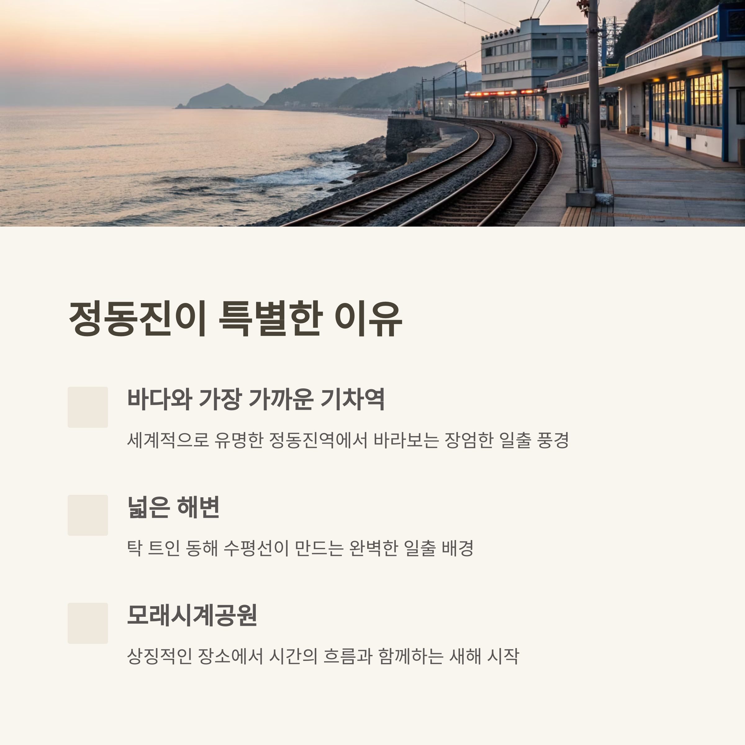 정동진에서의 일출, 여러분은 어떻게 느끼셨나요? 혹은 새해를 맞아 떠나고 싶은 또 다른 여행지가 있으신가요? 아래 댓글로 여러분의 소중한 이야기를 나눠주세요!