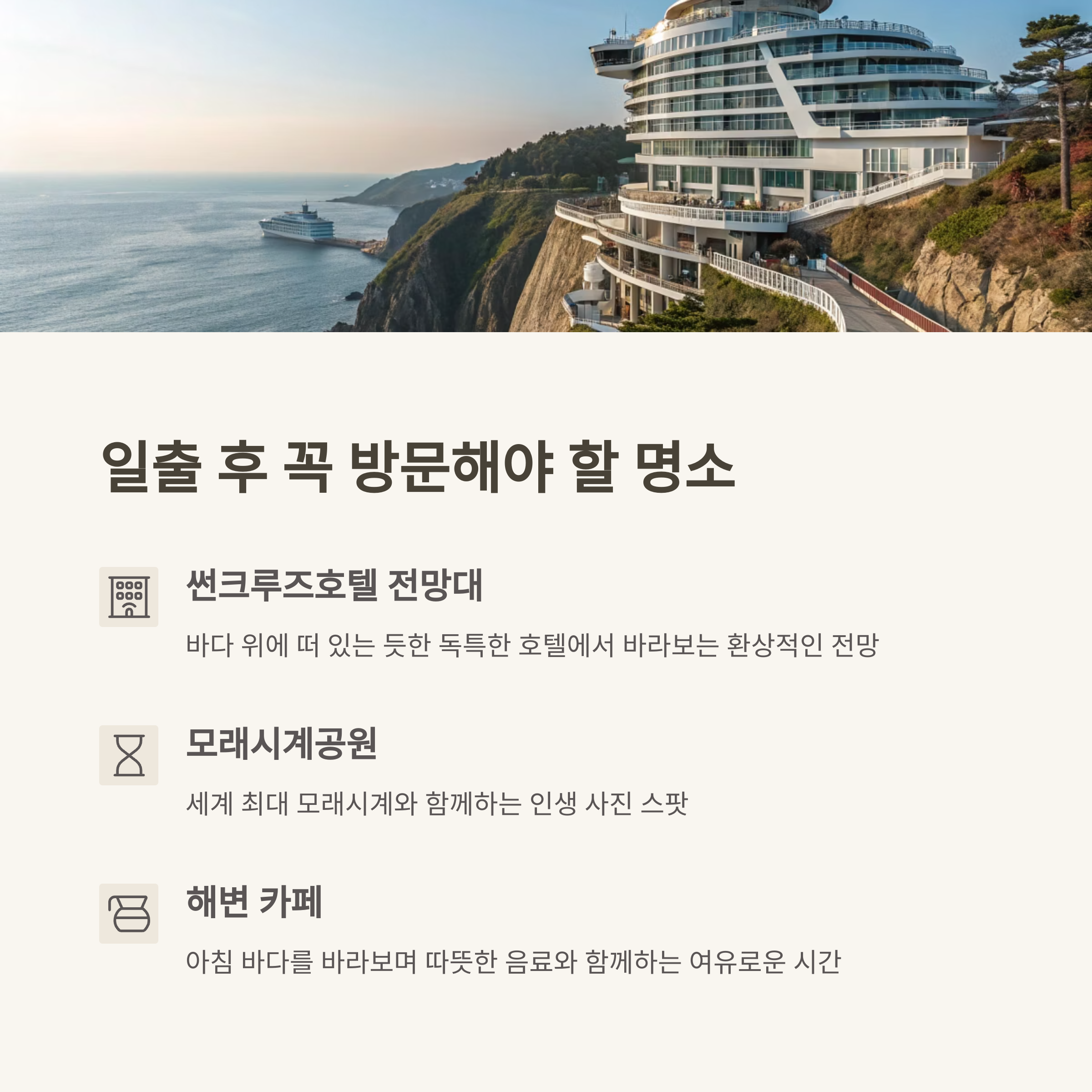 | 썬크루즈호텔 전망대와도 가까움 | 해돋이 감상을 위한 주요 포인트 체크 필수 | 인생 사진 촬영에 적합한 장소로 인기 |