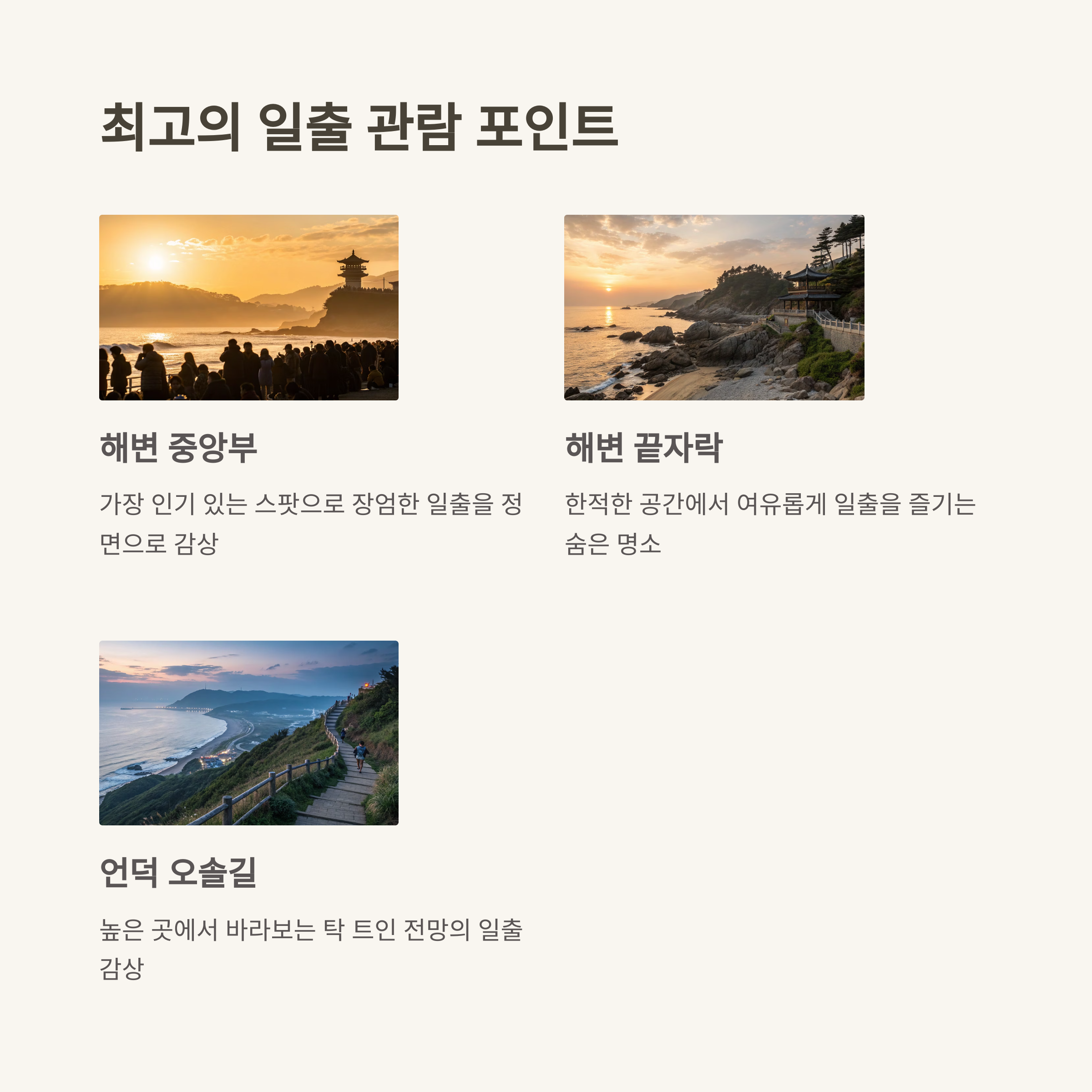 정동진 해변은 중앙부가 가장 인기 있는 관람 포인트입니다. 하지만 많은 인파를 피하고 싶다면 해변 끝자락이나 모래언덕으로 이어진 오솔길을 추천합니다. 상대적으로 여유로운 분위기에서 해돋이를 즐길 수 있고, 사진을 찍기에도 좋습니다. 또한 모래시계공원 근처는 문화 행사와 조형물, 벤치가 조화를 이루어 산책과 명상에도 제격입니다. 일출 직후에는 따뜻한 음료와 함께 여유롭게 아침을 시작할 수 있는 인근 카페에서 휴식을 취해보세요.