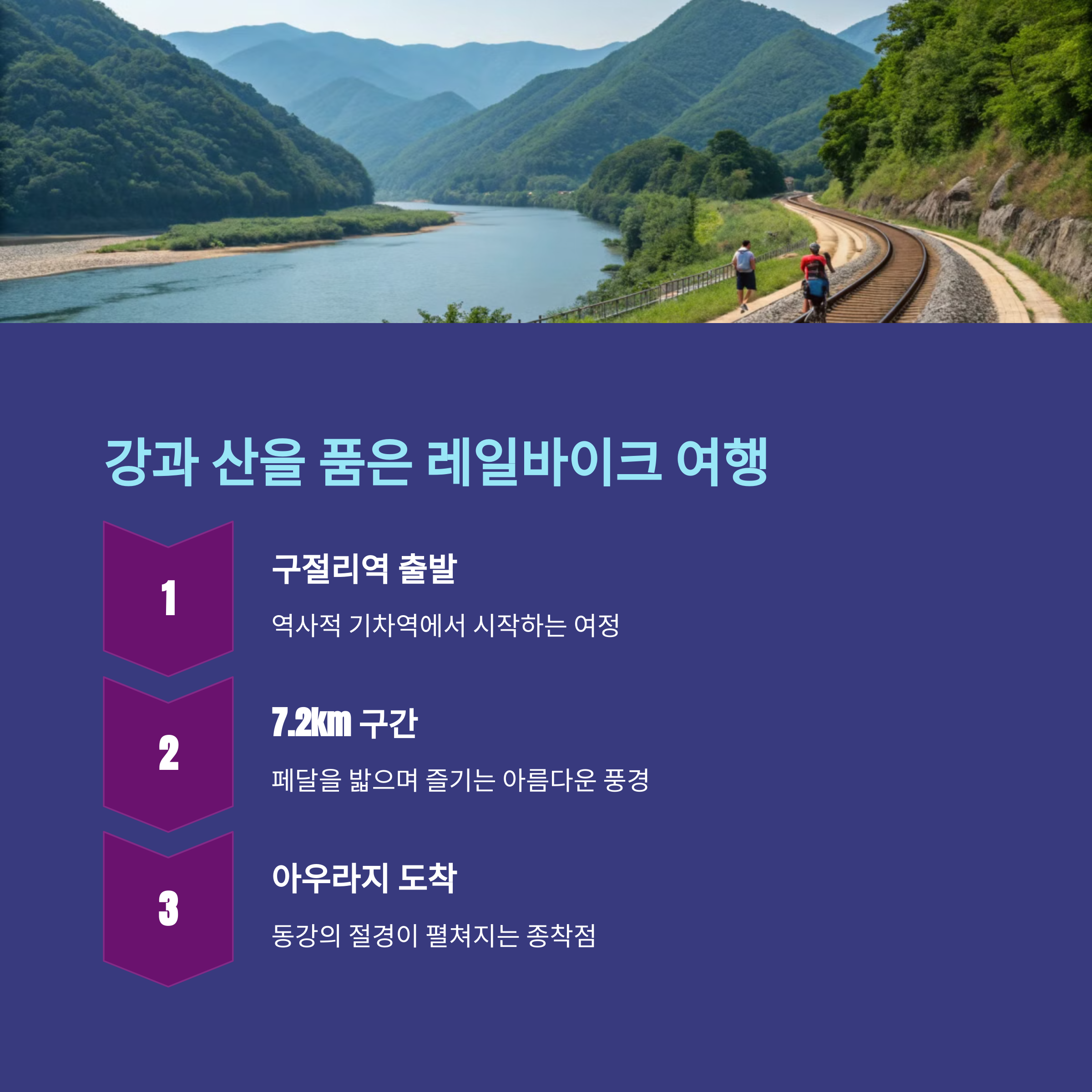 둘째 날은 조용한 아침 산책을 위해 정선 레일바이크를 추천합니다. 사람이 붐비는 시간대를 피해 오전 이른 시간에 이용하면 주변 산과 계곡을 온전히 감상할 수 있어 자연 그대로의 청량감을 만끽할 수 있습니다. 이후에는 아우라지 풍경길을 따라 천천히 걸으며 마무리 일정을 진행하세요. 인위적이지 않은 풍경과 함께, 도시에서는 느낄 수 없는 진짜 여유를 체험할 수 있습니다. 특별한 계획 없이도, 이 조용한 여행이 오히려 더 많은 위로를 건네줄 수 있습니다.